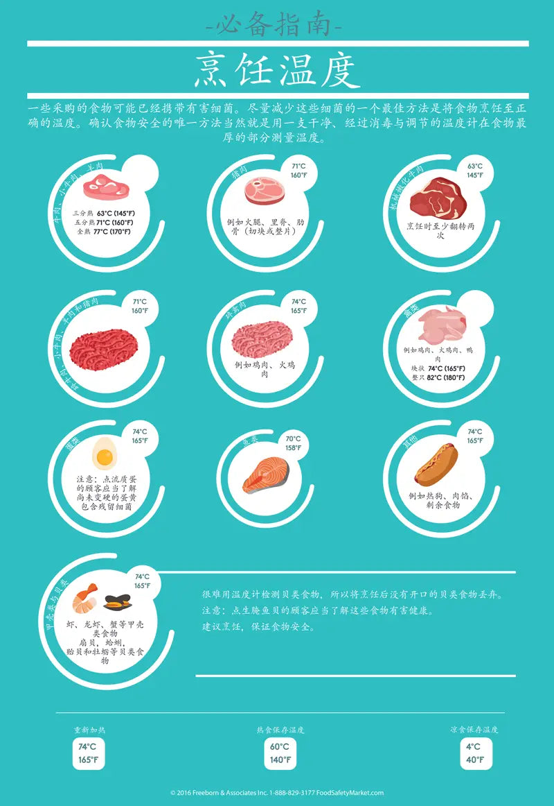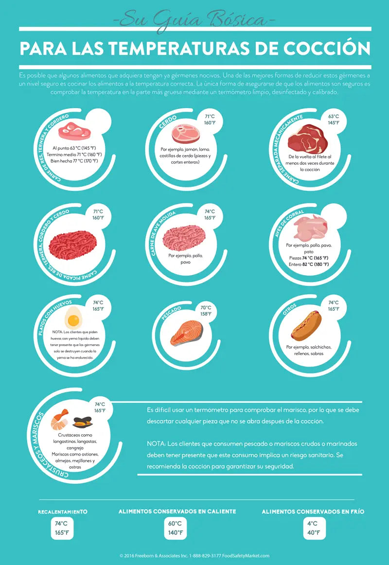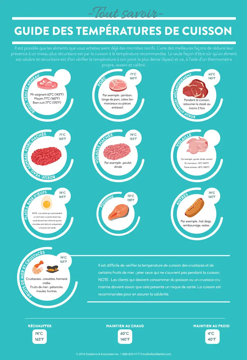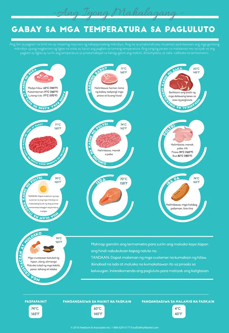 This Cooking Temperatures Infographic Poster keeps your food safe! Boasting an informative design imprinted on a premium cleanable finish, this poster illustrates the proper cooking temperatures for everything from beef to seafood and poultry, helping your food handlers prepare food safely.